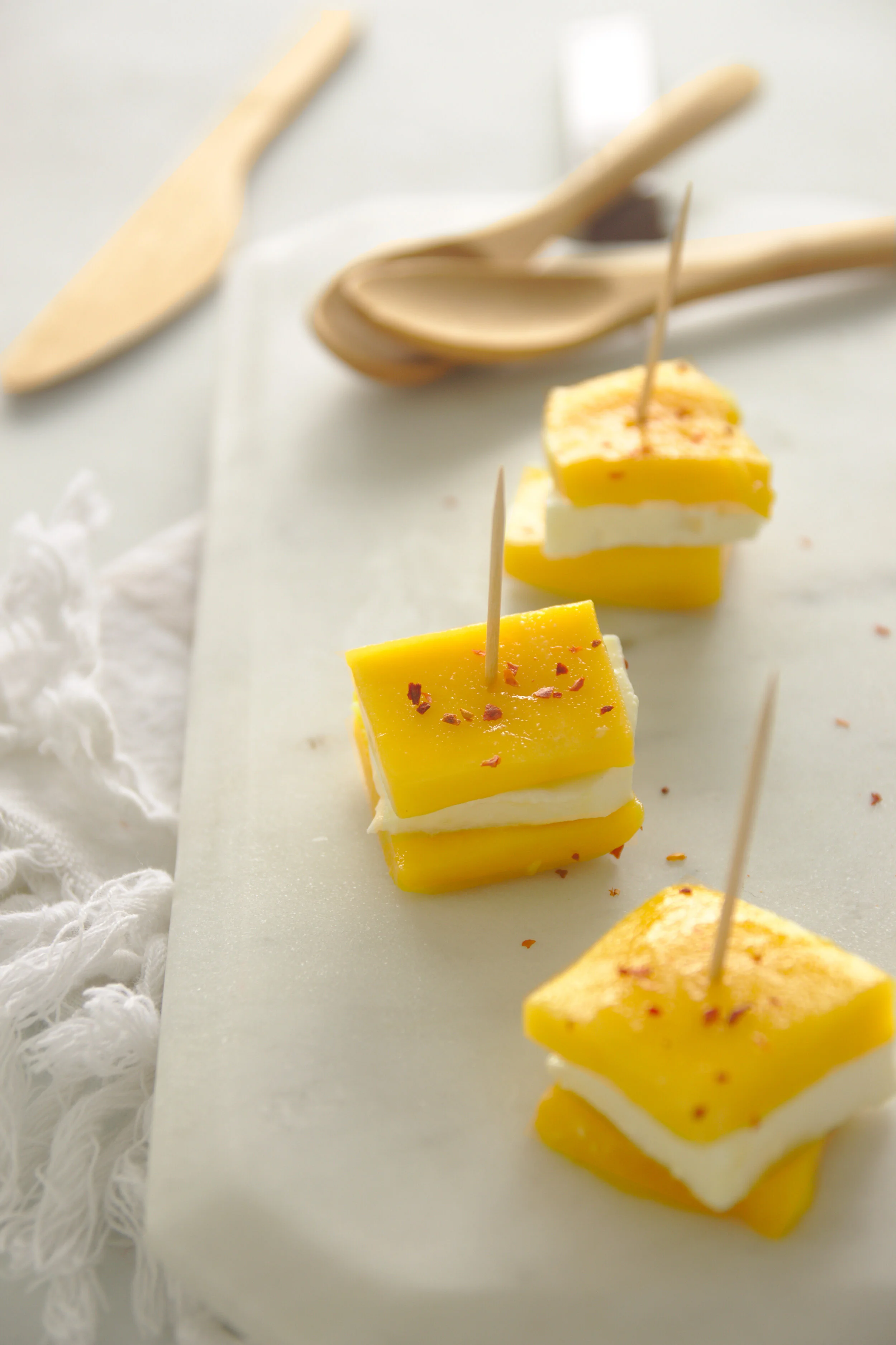 Mini sandwiches of mango, mozzarella and chilly pepper